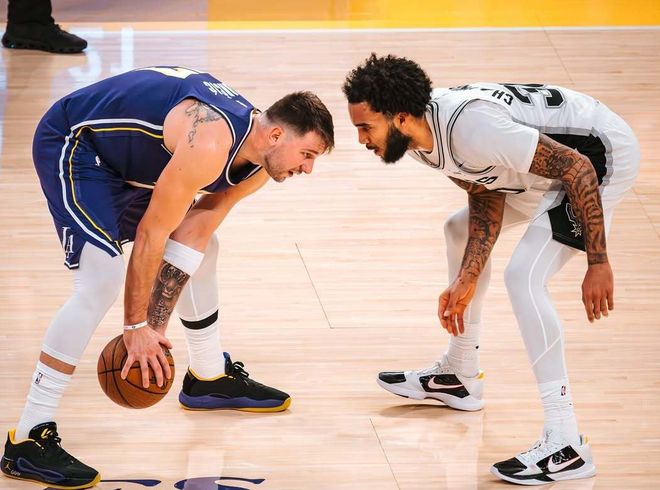 看起來東契奇防守很好,實則不然,這里注意,是防單打!因為東契奇有很多莫名其妙的失位,需要隊友去補。所以東契奇+斯馬特在場效果最佳,因為斯馬特防守端最玩命。再來說說壞的方面。東契奇在獨行俠時期就這么打,來到湖人后,他防守積極性確實有提升,但絕對不會成為像亞歷山大那樣攻防一體的超巨,他體能和專注度都無法維持。還有一點,東契奇往往在一些高端局,很容易情緒失控,追著裁判要罰球,得不到罰球他就有些消極成分,比如盲目在外線扔三分球,效率下滑比較嚴重!東契奇本賽季兩項命中率47.1%+33.7%。