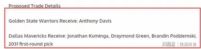 勇士將通過交易得到超級內線濃眉,而達拉斯獨行俠則收獲喬納森·庫明加、德雷蒙德·格林、布蘭丁·波杰姆斯基以及2031年首輪選秀權。這筆交易堪稱各取所需,無論對志在沖冠的勇士,還是潛心重建的獨行俠,都有著里程碑式的意義。